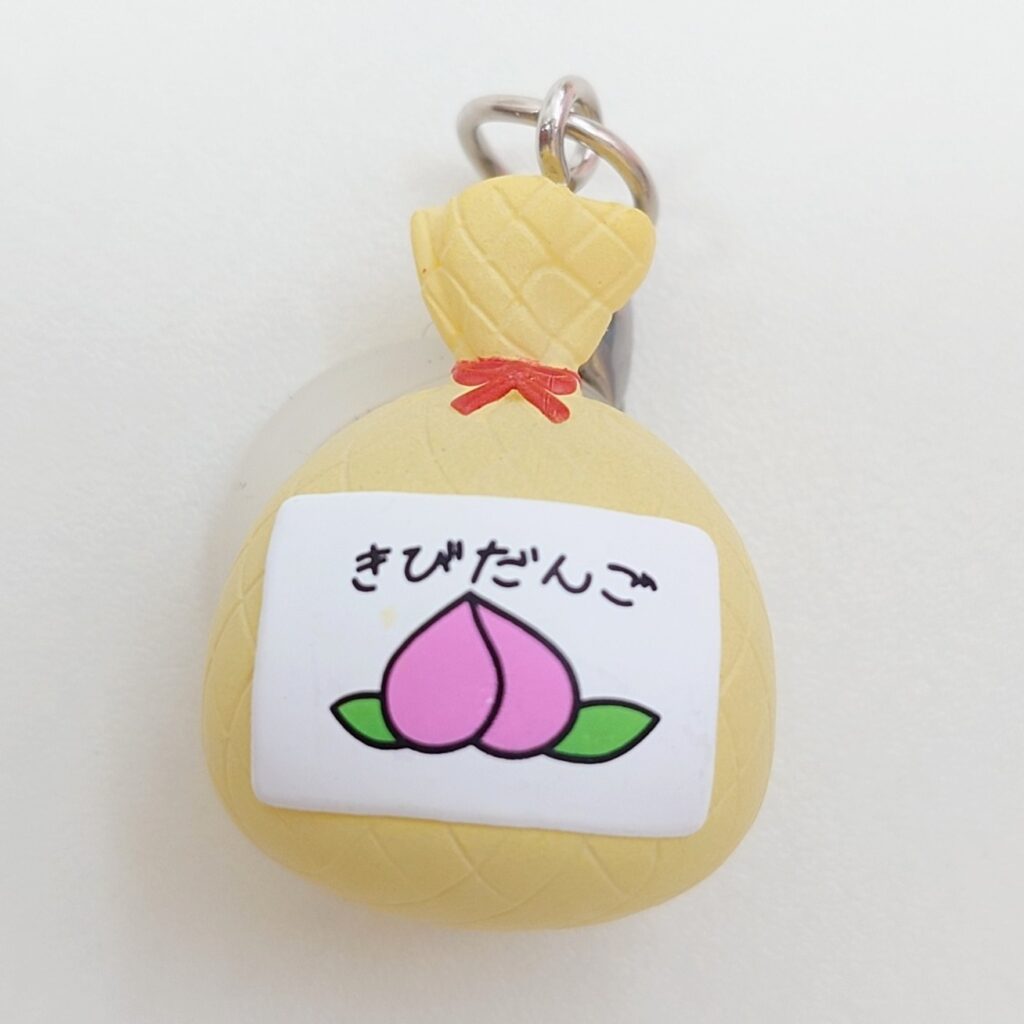 「桃の絵、そして上にひらがなで「きびだんご」と描かれた網袋に団子が数十個入っており、食べた動物は必ず与えた人間になつく。」