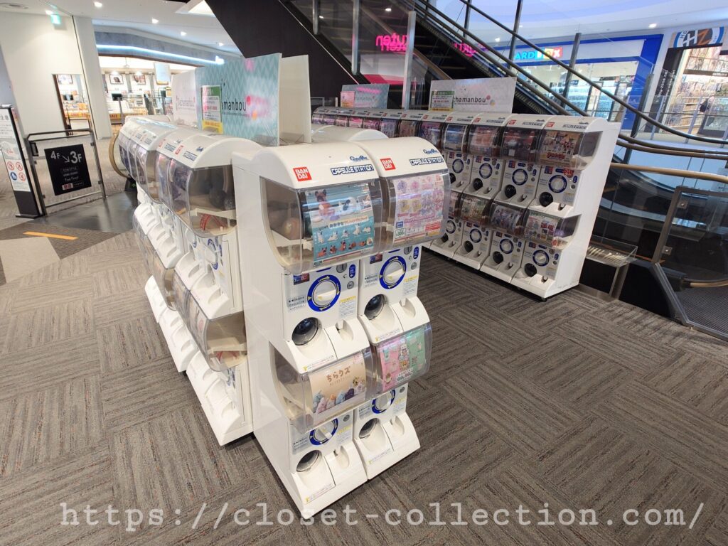 サンリオ等のキャラクターもの、食品ミニチュア系、動物等のかわいいフィギュア等、全てジャンル別に設置されているので目当てのガチャが探しやすいです。